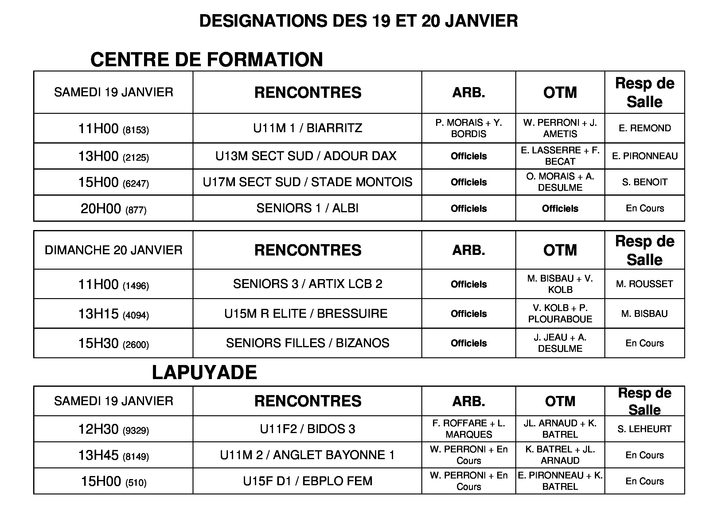 Jimmy vous a nommé à la table de marque, arbitrage ou responsable de salle pour les 19 et 20 janvier. Je vous remercie par avance de consulter le tableau suivant. Pour ceux et celles qui auraient un empêchement de dernière minute merci de contacter au plus vite Jimmy afin de lui donner le nom de votre remplaçant(e).