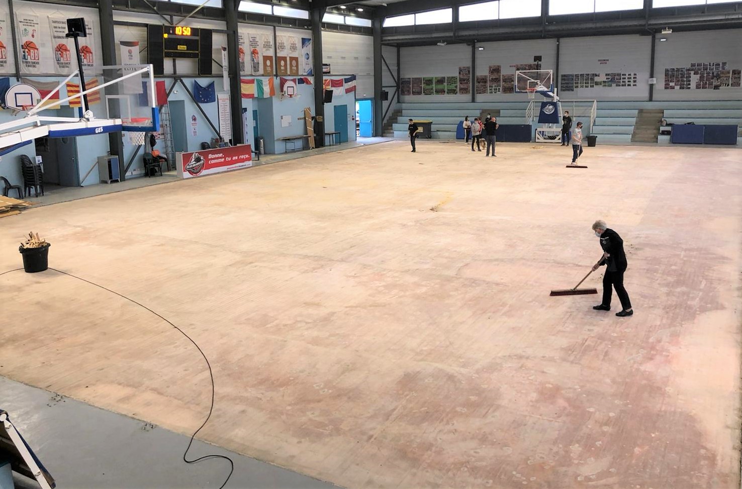 Samedi, les bénévoles, joueurs et joueuses du club se sont réunis pour préparer la 1ère étape du chantier de rénovation du parquet de la Salle Bruno Tarricq mené par la